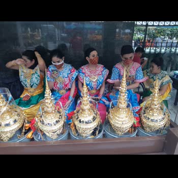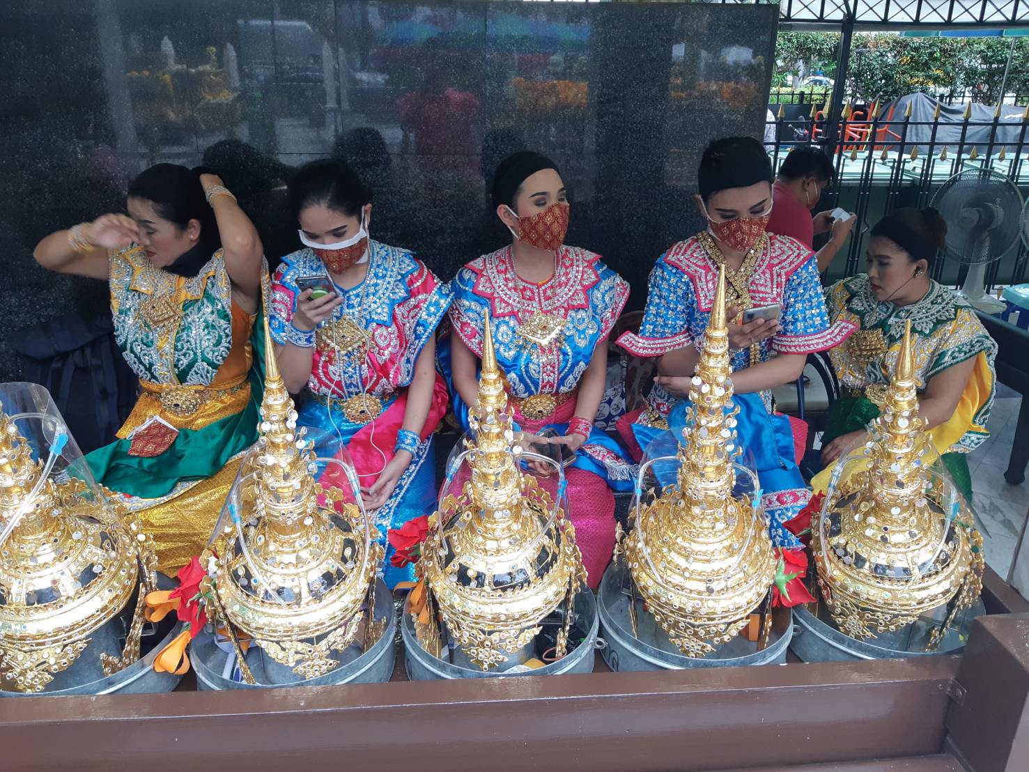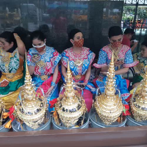 | คำอธิบาย : นางรำที่แต่งองค์ทรงเครื่องเรียบร้อย เตรียมรำถวายมือ เพื่อแก้บน แก่เจ้าภาพ |