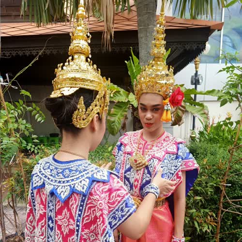 | คำอธิบาย : นางรำที่แต่งองค์ทรงเครื่องเรียบร้อย เตรียมรำถวายมือ เพื่อแก้บน แก่เจ้าภาพ |
