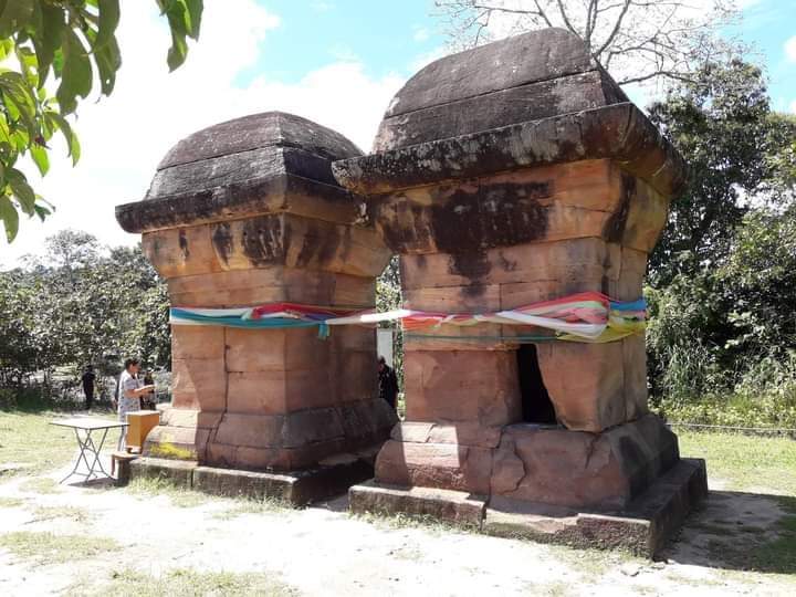 | คำอธิบาย : สถูปคู่ เขาพระวิหาร เป็นโบราณวัตถุมีอยู่ 2 องค์ ตั้งคู่อยู่บริเวณทิศตะวันตก ของผามออีแดง มีลักษณะเป็นสี่เหลี่ยมลูกบาศก์ขนาดหน้ากว้าง 1.93 เมตร สูง 4.20 เมตร ยอดมนคล้ายตะปูหัวเห็ด ข้างในเป็นโพรงบรรจุสิ่งของ ก่อสร้างด้วยหินทรายเป็นท่อนที่ตัดและตกแต่งอีกที |