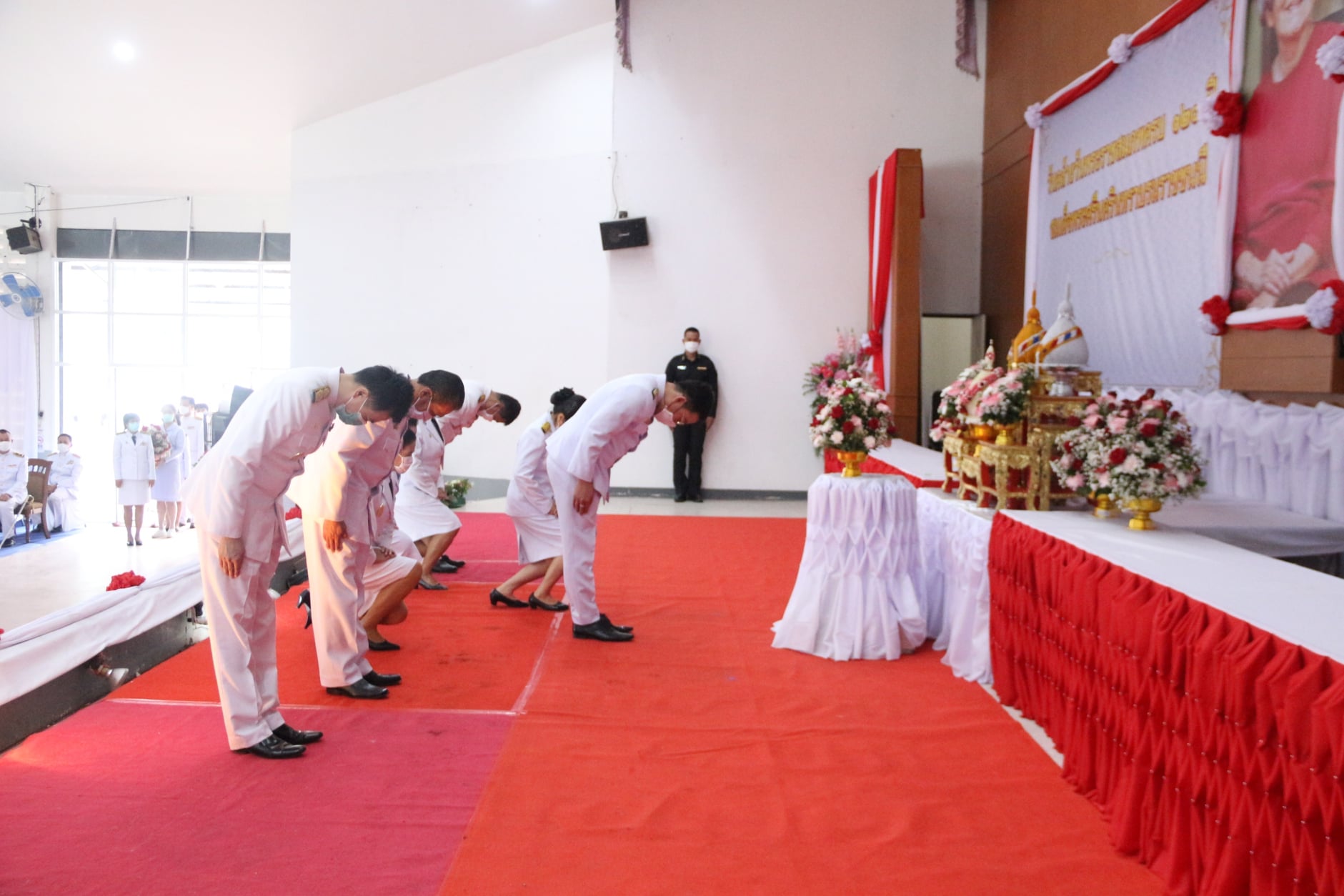 | คำอธิบาย : นายณัฐพล ดีบุญมี ณ ชุมแพ รองนายกเทศมนตรีเมืองชุมแพ และพนักงานเทศบาลร่วมพิธีทำบุญตักบาตรและวางพานพุ่มดอกไม้สด เพื่อแสดงออกถึงความจงรักภักดีและน้อมรำลึกในพระมหากรุณาธิคุณสมเด็จพระศรีนครินทราบรมราชชนนี เนื่องในวันคล้ายวันพระราชสมภพครบ 120 ปี สมเด็จพระศรีนครินทราบรมราชชนนี เมื่อวันที่ 21 ตุลาคม 2563 ณ หอประชุมอำเภอชุมแพ |
