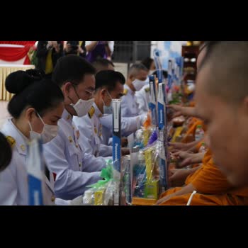 พิธีทำบุญตักบาตรและวางพานพุ่มดอกไม้สด ได้รับใบอนุญาตภายใต้ ให้เผยแพร่-ดัดแปลง-โดยต้องระบุที่มาแต่ห้ามใช้เพื่อการค้า 3.0 Thailand.