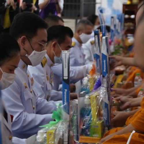 | ชื่อเรื่อง : พิธีทำบุญตักบาตรและวางพานพุ่มดอกไม้สด |