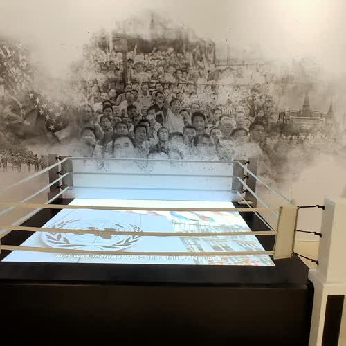 "นิทรรศการ ล่องรอยราชดำเนิน: เวทีมวย (จำลอง) ฉายวีดิทัศน์บรรยากาศของเวทีมวยราชดำเนิน".