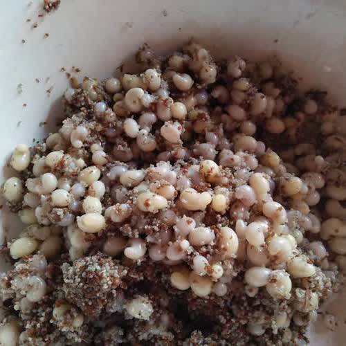 | คำอธิบาย : ไข่อ่อนของแมงมัน เป็นส่วนที่อยู่ในดิน ได้จากการขุดจากโพรงเท่านั้น วิธีการขุดหาไข่แมงมัน มักจะขุดในช่วงหน้าหนาวย่างเข้าสู่หน้าแล้ง ประมาณเดือนกุมภาพันธ์ ถึงเดือนเมษายน โดยการหาแหล่งรังหรือโพรงที่อยู่ของแมงมัน โดยดูจากบริเวณที่แมงมันเคยออก สังเกตจากการพบแม่แมงมัน จากรูเล็ก ๆ จากนั้นจึงขุดตามรูไปเรื่อย ๆ จนกระทั่งพบโพรงไข่สำรองที่เรียกว่า โผ้งเผาะ ซึ่งเป็นรังขนาดเล็กแต่ก็มีไข่แมงมันอยู่บ้าง จากนั้นค่อย ๆ ขุดลงไปจะพบโพรงจริงที่เรียกว่า โผ้งใหญ่ จะพบไข่เป็นจำนวนมาก แล้วค่อย ๆ ตักไข่แมงมันทั้งหมด จากนั้นนำไข่ทั้งหมดมากรองด้วยผ้าขาวบาง ค่อย ๆ เทน้ำล้างเพื่อคัดเอารัง เศษดิน เศษรากไม้ออก แล้วแต่ไข่ ตัวอ่อน และดักแด้ มาทำเป็นอาหาร ซึ่งสามารถนำไปทำเมนูอาหารได้หลายอย่าง เช่น ตุ๋นใส่ไข่ ดองไข่แมงมัน จ่อมไข่แมงมัน ผัดกับผัก ยำไข่แมงมัน ใส่ไข่เจียว และแกงใส่ผัก |