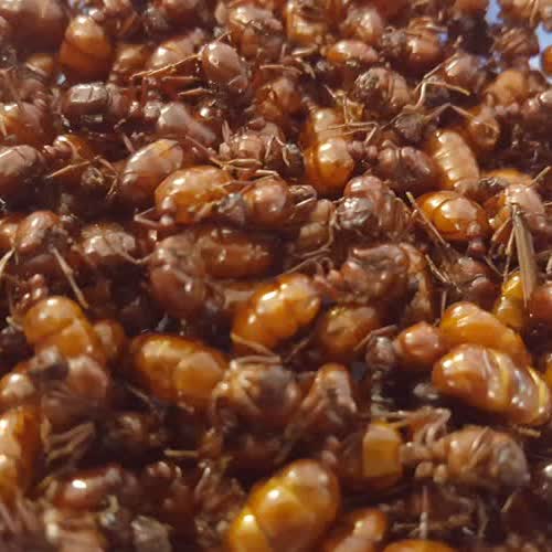 | คำอธิบาย : แมงมัน เป็นมดดินชนิดหนึ่ง ที่คนทางภาคเหนือนิยมรับประทานเป็นอาหาร โดยเฉพาะที่เป็น แมงมันตัวเมีย ซึ่งมีสีแดงคล้ำ ตัวใหญ่ มีรสมัน ตัวแก่ของแมงมัน ซึ่งจะออกมาจากโพรงหรือพื้นดินที่อาศัยอยู่เพียงครั้งเดียวในรอบ 1 ปี ลักษณะจะคล้าย ๆ กับแม่เป้งมดแดง แต่จะสีแดงเข้มและตัวใหญ่กว่า เรียกว่า "แมงมันแม่" นิยมนำไปคั่วและตำน้ำพริก วิธีการเก็บแมงมันจะต้องใช้ความอดทน เพราะต้องไปนั่งเฝ้ารอที่หน้ารูเพื่อรอจังหวะแมงมันออกมา ส่วนไข่อ่อนของแมงมัน เป็นส่วนที่อยู่ในดิน ได้จากการขุดจากโพรงเท่านั้น |