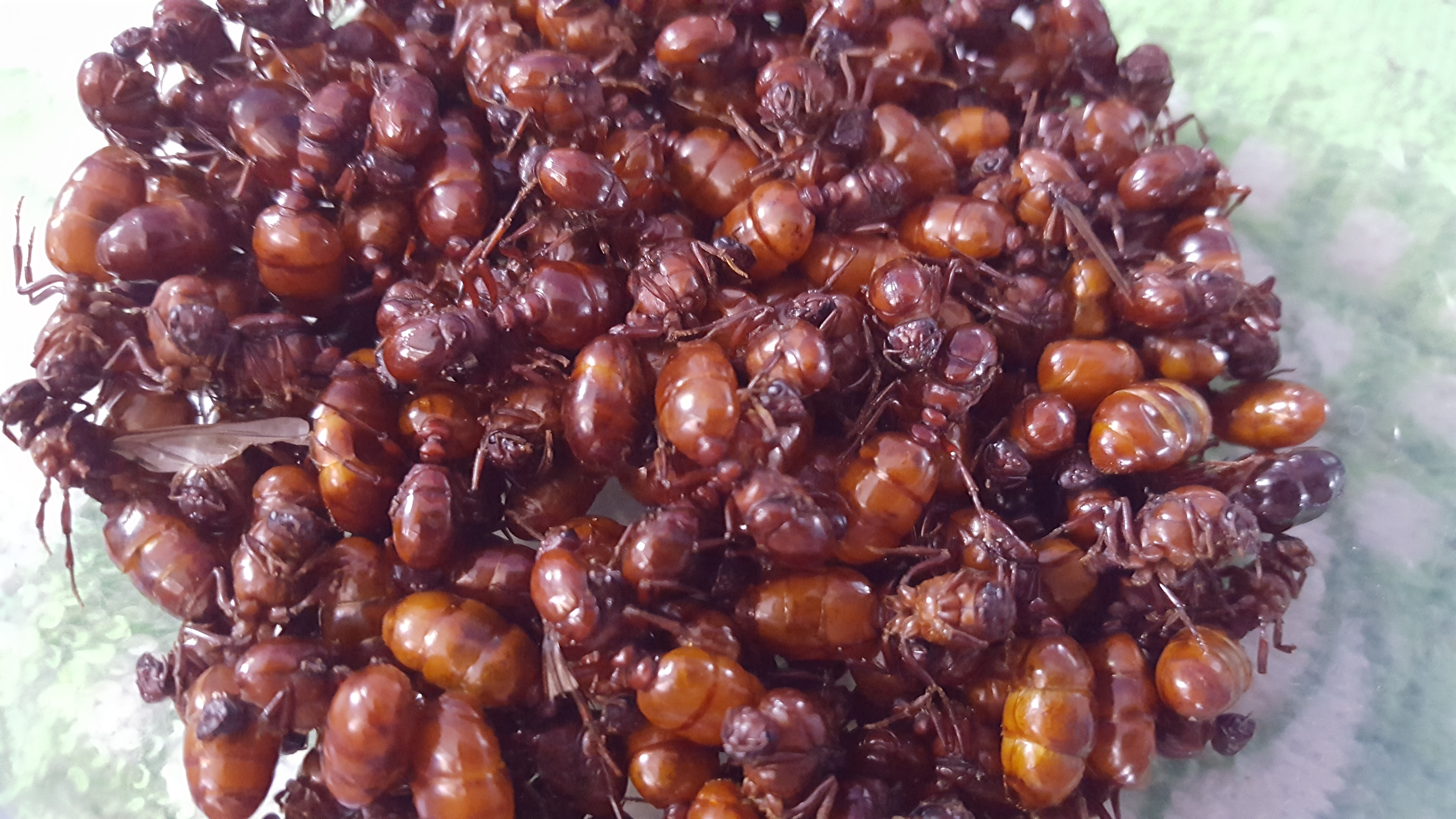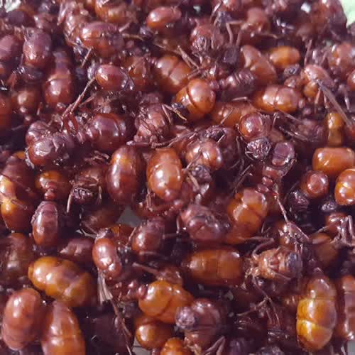 | คำอธิบาย : แมงมัน เป็นมดดินชนิดหนึ่ง ที่คนทางภาคเหนือนิยมรับประทานเป็นอาหาร โดยเฉพาะที่เป็น แมงมันตัวเมีย ซึ่งมีสีแดงคล้ำ ตัวใหญ่ มีรสมัน ตัวแก่ของแมงมัน ซึ่งจะออกมาจากโพรงหรือพื้นดินที่อาศัยอยู่เพียงครั้งเดียวในรอบ 1 ปี ลักษณะจะคล้าย ๆ กับแม่เป้งมดแดง แต่จะสีแดงเข้มและตัวใหญ่กว่า เรียกว่า "แมงมันแม่" นิยมนำไปคั่วและตำน้ำพริก วิธีการเก็บแมงมันจะต้องใช้ความอดทน เพราะต้องไปนั่งเฝ้ารอที่หน้ารูเพื่อรอจังหวะแมงมันออกมา ส่วนไข่อ่อนของแมงมัน เป็นส่วนที่อยู่ในดิน ได้จากการขุดจากโพรงเท่านั้น |
