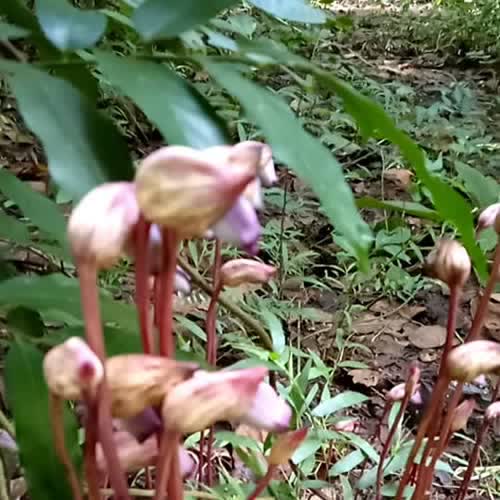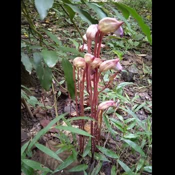 | คำอธิบาย : ดอกดินแดง ดอกดินม่วง หญ้าดอกขอปากจะเข้ เป็นพืชเบียนขนาดเล็ก ไม่มีใบ มีชีวิตอยู่แบบกาฝาก อาศัยเกาะอยู่กับรากหญ้าคา หรือรากไม้ไผ่ใต้ดิน ก้านดอกมีสีขาวนวล ดอกโผล่มาเหนือดิน กลีบดอกเป็นหลอด สีม่วงเข้ม ตอนปลายเป็นแฉก ในดอกมีสารสีดำ สามารถทำขนมได้ เรียกว่า ขนมดอกดิน |