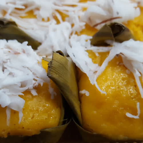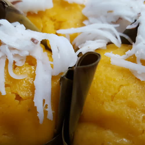 | คำอธิบาย : ขนมตาล เป็นขนมไทยดั้งเดิม ที่เนื้อขนมทำจากเนื้อตาลมีลักษณะเป็นแป้งสีเหลืองเข้ม นุ่ม ฟู มีกลิ่นตาลหอมหวาน |