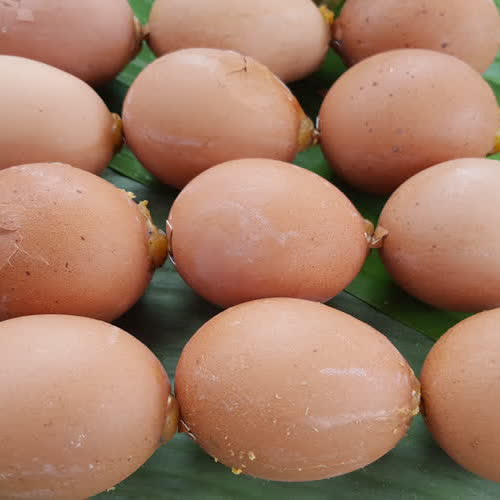 | คำอธิบาย : ไข่ปิ้ง เป็นการนำไข่ไก่มาเจาะรูเล็ก ๆ เอาไข่ออกมาตีใส่เครื่อง พวกพริกไทย น้ำปลา ซีอิ้วขาว ปรงรสตามชอบ แล้วนำไข่ที่ปรุงเสร็จแล้วไปกรอกคืนในไข่ไก่ จากนั้นนำไปปิ้งบนถ่านไฟอ่อน ๆ จนสุก รับประทานได้ |