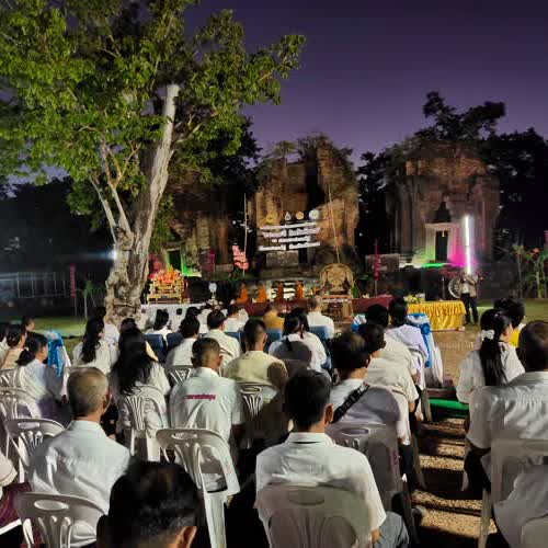 | คำอธิบาย : ชาวอำเภอปรางค์กู่ จังหวัดศรีสะเกษ ร่วมทำวัตรเย็น พิธีเจริญพระพุทธมนต์เย็น ฟังธรรม ณ ปราสาทปรางค์กู่ เนื่องในงานเฉลิมฉลอง 238 ปี จังหวัดศรีสะเกษ |