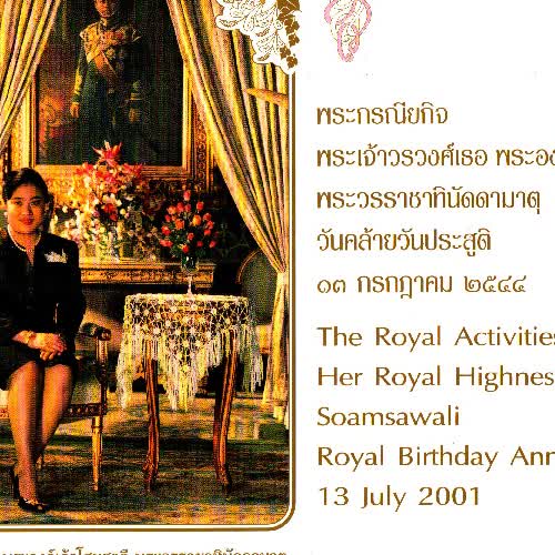 (2563). แผ่นพับพระกรณียกิจพระเจ้าวรวงศ์เธอ พระองค์เจ้าโสมสวลี พระวรราชาทินัดดามาตุ วันคล้ายวันประสูติ ๑๓ กรกฎาคม ๒๕๔๔,