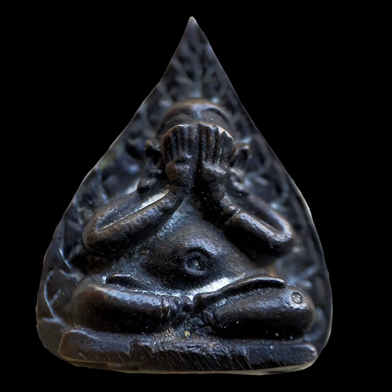 "พระปิดตาเนื้อนวโลหะ หลังยันต์นะ พิมพ์ใบโพธิ์ สร้างปี 2523".