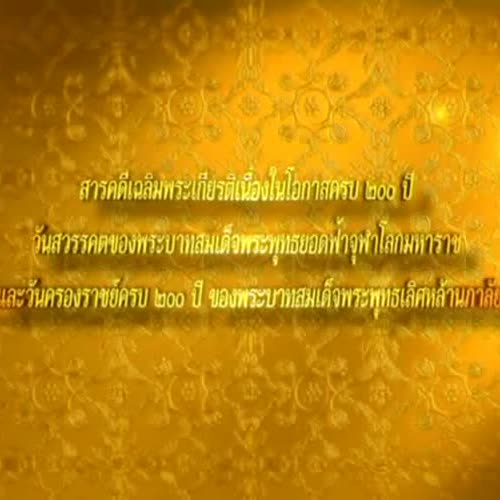 | ชื่อเรื่อง : สารคดีเฉลิมพระเกียรติเนื่องในโอกาศวันครองราชย์ครบ ๒๐๐ ปี ของพระบาทสมเด็จพระพุทธเลิศหล้านภาลัย ตอน สถาปนาพระเกียรติสมเด็จพระบรมราชชนนี เฉลิมพระยศพระราชวงศานุวงศ์ |