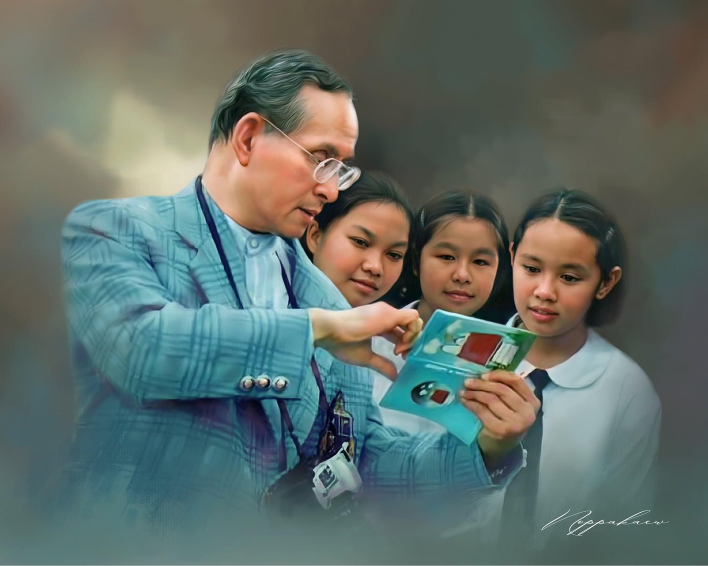 | คำอธิบาย : “พระผู้ทรงเป็นครูแห่งแผ่นดิน” เป็นครูใช่ไหม ขอฝากเด็กๆ ด้วยนะ ช่วยสอนให้เขาเป็นคนดี..พระราชดำรัสของพระบาทสมเด็จพระเจ้าอยู่หัว ร.๙วันที่ ๑ มีนาคม พ.ศ. ๒๕๐๑ อำเภอศรีสำโรง จังหวัดสุโขทัย เทคนิค(ดิจิตอล เพ้นท์ติ้ง)อาจารย์นพแก้ว ประยูรเมธากลุ่มศิลปินสองแผ่นดิน |