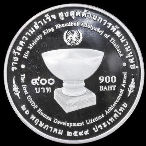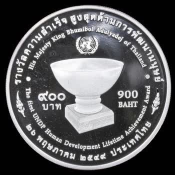 เหรียญในหลวงรัชกาลที่ 9 ที่ระลึกรางวัลความสำเร็จสูงสุดด้านการพัฒนามนุษย์ (UNDP) ปี 2549 เนื้อเงินบริสุทธิ์ 99.9% ขัดเงาและลงสี ได้รับใบอนุญาตภายใต้ ให้เผยแพร่-โดยต้องระบุที่มาแต่ห้ามดัดแปลงและห้ามใช้เพื่อการค้า 3.0 Thailand.