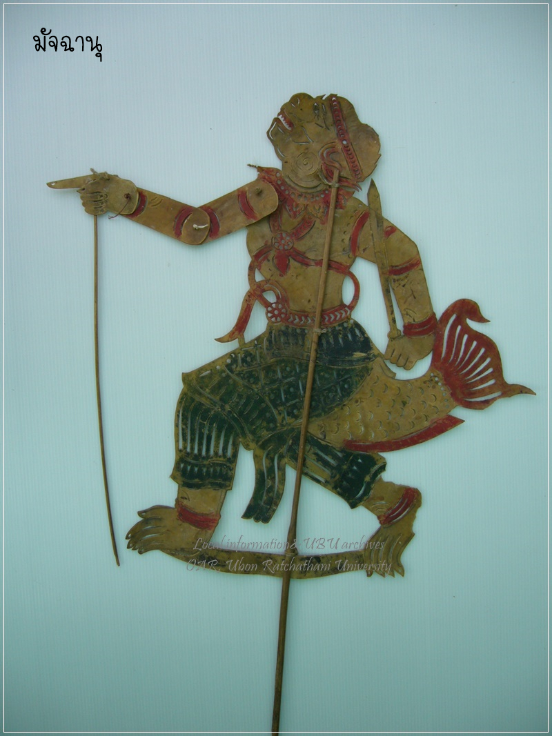 | คำอธิบาย : หนังรูปมัจฉานุใช้ในการแสดงหนังประโมทัย หนังบักตื้อ หรือหนังตะลุงอีสาน การละเล่นพื้นเมืองในภาคอีสาน เรื่องรามเกียรติ์ |