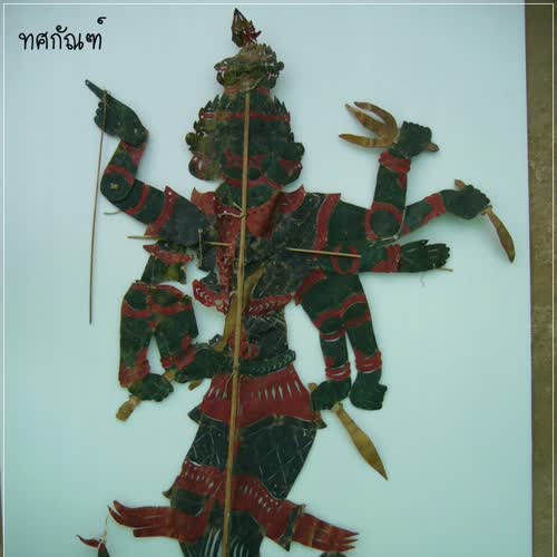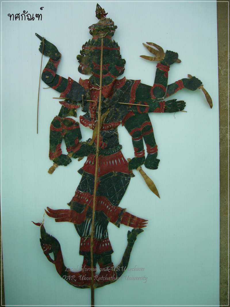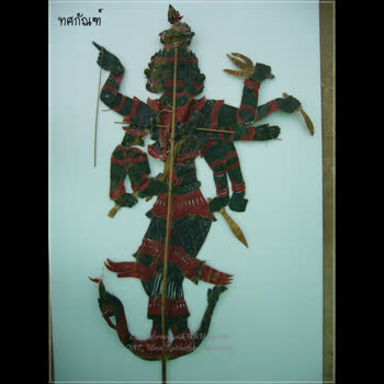 | คำอธิบาย : หนังรูปทศกัณฑ์ใช้ในการแสดงหนังประโมทัย หนังบักตื้อ หรือหนังตะลุงอีสาน การละเล่นพื้นเมืองในภาคอีสาน เรื่องรามเกียรติ์ |