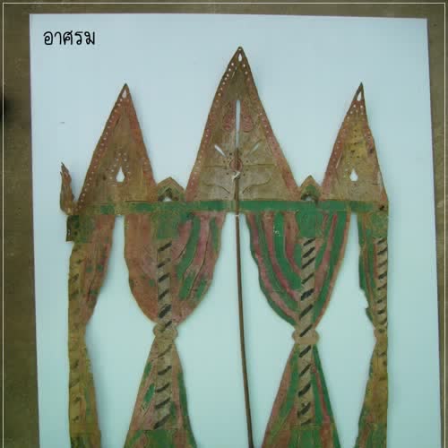 คำอธิบาย : หนังรูปอาศรมใช้ประกอบฉากในการแสดงหนังประโมทัย หนังบักตื้อ หรือหนังตะลุงอีสาน การละเล่นพื้นเมืองในภาคอีสาน |