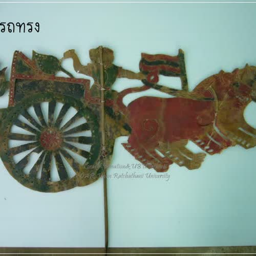 | คำอธิบาย : หนังรูปราชรถทรง ใช้ประกอบฉาก ในการแสดงหนังประโมทัย หนังบักตื้อ หรือหนังตะลุงอีสาน การละเล่นพื้นเมืองในภาคอีสาน |