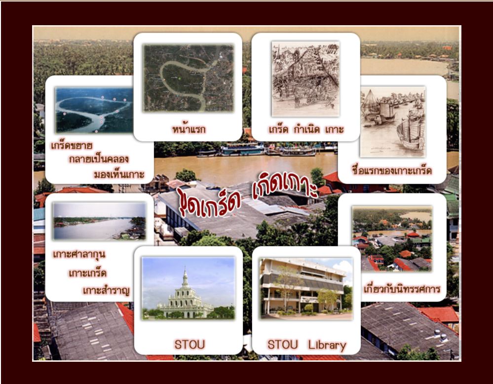 | คำสำคัญ : เกาะเกร็ด, ข้อมูลท้องถิ่นนนทบุรี, นวัตกรรมบรรณสาร, เกาะศาลากุน, นิทรรศการออนไลน์, อำเภอปากเกร็ด |