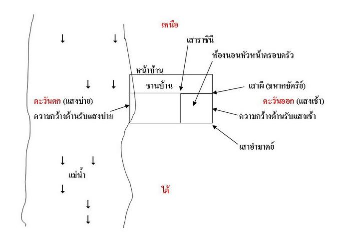 | คำอธิบาย : มอญขวาง หมายถึง การหันหน้าบ้านไปทางเหนือและขวางทางไหลของแม่น้ำ เป็นการแสดงภูมิปัญญาสุดยอดในการสร้างบ้านของคนมอญ ตั้งแต่การปรับตัวเข้ากับธรรมชาติเมืองร้อนและการสร้างบ้านริมน้ำ รวมทั้งภูมิปัญญาในการอธิบายเชิงวัฒนธรรมบ้านส่วนใหญ่มักมีแบบแปลนเป็นสี่เหลี่ยมผืนผ้า การหันด้านกว้างของสี่เหลี่ยมผืนผ้าไปหาแสงแดดเช้าและบ่าย นั้น ก็เพื่อให้ส่วนน้อยของตัวบ้านได้รับความร้อนจากแสงแดด หากหันด้านยาวของบ้านรับแสงแดดก็จะมีพื้นที่รับแสงแดดมากกว่าทำให้ร้อนกว่า |