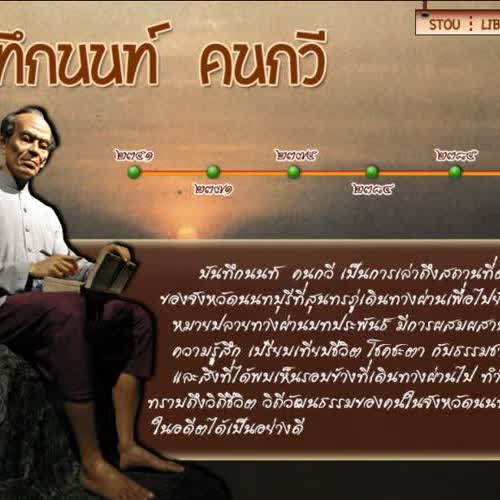 | คำอธิบาย : บันทึกนนท์ คนกวี เป็นการบอกเล่าถึงสถานที่ต่างๆ ของจังหวัดนนทบุรีที่สุนทรภู่กวีเอกสมัยรัชกาลที่ 2 ของกรุงรัตนโกสินทร์ เดินทางผ่านเพื่อไปยังจุดหมายปลายทาง ผ่านบทประพันธ์ประเภทนิราศที่ผสมผสานความรู้สึก เปรียบเทียบชีวิต โชคชะตากับธรรมชาติและสิ่งที่พบเห็นรอบข้างที่เดินทางผ่านไปทำให้ทราบถึงวิ๔ีชีวิต วิถีวัฒนธณรมของคนในจังหวัดนนทบุรีในอดีตได้เป็นอย่างดี |