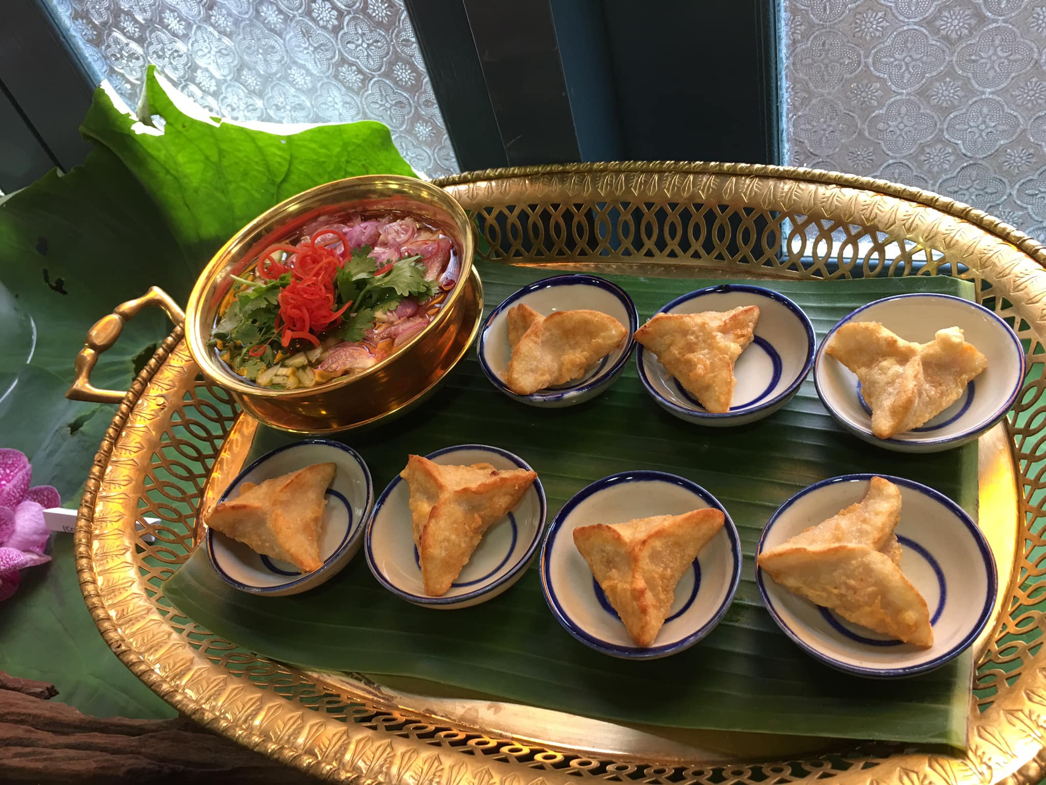 | คำอธิบาย : ขนมที่ทำมาจากเผือก กุ้ง แป้ง โดยปั้นเป็นสามเหลี่ยมแล้วนำไปทอด และกินคู่กับอาจาด |