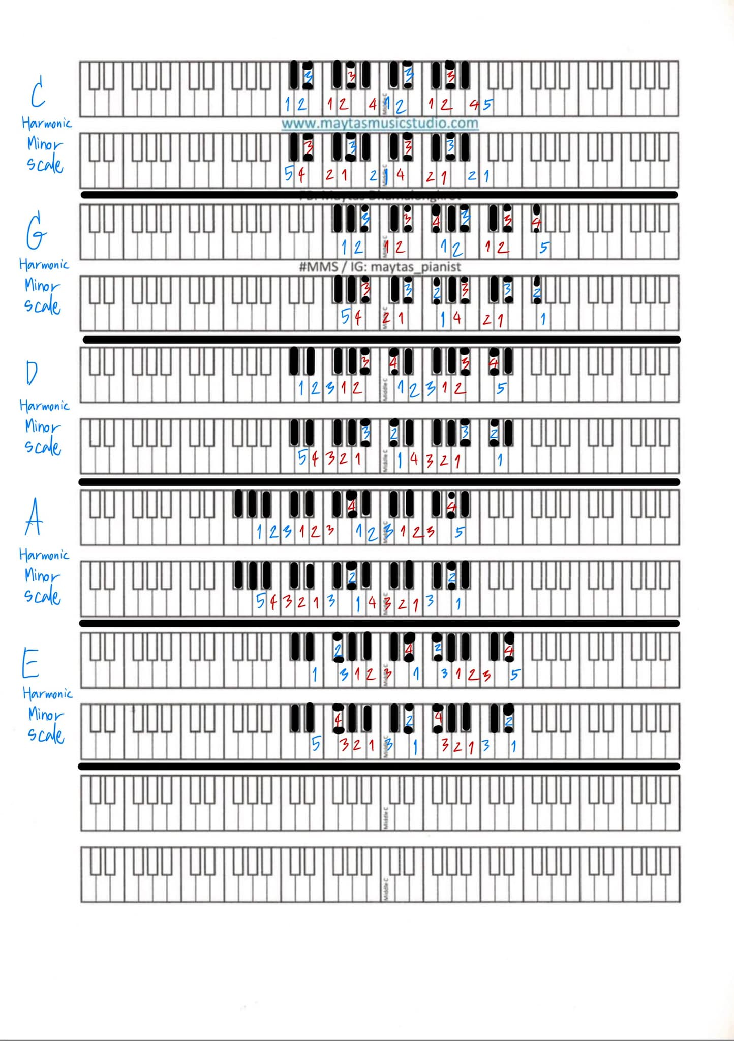 | คำอธิบาย : วิธีการฝึก1. ฝึกทีละ 1 มือ ช้า ๆ จนคล่อง อาจเล่นไปพูดหมายเลขนิ้วไป เพื่อให้เกิดความมั่นใจ2. เล่นให้เสียง Clear ไม่ซ้อนกัน รักษาระดับความดังเบาให้คงที่3. ใช้นิ้วให้ถูกต้อง พยายามให้ข้อมือนิ่งที่สุด ให้นิ้วออกแรงอย่างถูกต้อง4. เมื่อเล่นจนคล่องระดับหนึ่ง อาจใช้เครื่องเคาะจังหวะช่วย5. เล็บต้องสั้นแต่พอดี6. นั่งในท่าทางที่เหมาะสม7. อย่าใจร้อน8. อาจนำ MMS Magic Tool มาฝึกลอกนิ้วลงไปเพื่อให้แม่นขึ้น9. ควรเล่นซ้ำจนจำได้ จำไว้ว่า Scales และ Chords คือสูตรคูณของดนตรี10. ควรทำความเข้าใจทฤษฎีและที่มาของ Harmonic Minor Scales ให้เข้าใจ11. สามารถฝึกควบคู่กับ Top Speed Technique ของอ.เมธัสได้12. เมื่อเล่นแต่ละมือคล่องแล้ว ให้รวม 2 มือเข้าด้วยกัน โดยเสียงของมือทั้งสองข้าง ต้องออกมาพร้อมกัน และเท่าเทียมกัน โดย อาจเว้นระยะระหว่างมือทั้ง 2 มือให้ห่างกัน 2 Octaves เพื่อให้สามารถได้ยินเสียงของมือซ้ายแยกจากมือขวาได้ชัดขึ้น13. หากฝึกควบคู่ไปกับ Minor Scales ชนิดต่าง ๆ ต้องระวังงง ควรฝึกแยกกัน เอาให้แม่นเป็นชนิด ๆ ไปScales ชุดนี้ประกอบไปด้วยC Harmonic Minor ScaleG Harmonic Minor ScaleD Harmonic Minor ScaleA Harmonic Minor ScaleE Harmonic Minor Scaleควรฝึก Major Scale 5 อันที่เคยลงไว้ในเพจ“Maytas Dhamalongkrot - Piano Teacher”Album “Basic ดนตรี” จนแม่นก่อนแล้วค่อยมาฝึกแบบฝึกหัดนี้ |