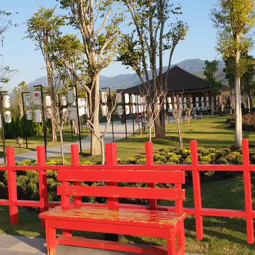 "ม้านั่งสีแดงที่หมู่บ้านญี่ปุ่น".