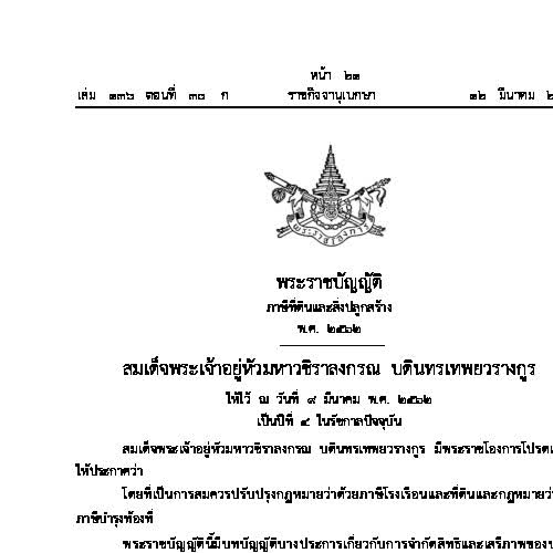 | คำสำคัญ : พระราชบัญญัติภาษีที่ดินและสิ่งปลูกสร้าง, พระราชบัญญัติ, ราชกิจจานุเบกษา, พ.ร.บ., สิ่งปลูกสร้าง, ที่ดิน |