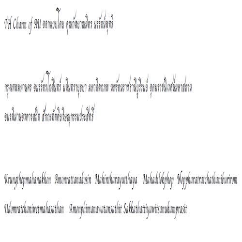 | คำอธิบาย : ฟอนต์ TH Charm of AU (ชาร์ม ออฟ เอยู) ออกแบบโดย คุณกัลยาณมิตร นรรัตน์พุทธิในปี พ.ศ. 2553 ด้วยกรมทรัพย์สินทางปัญญา ร่วมกับสำนักงานส่งเสริมอุตสาหกรรมซอฟต์แวร์แห่งชาติ (องค์การมหาชน) ได้จัดโครงการประกวดผลงานสร้างสรรค์โปรแกรมคอมพิวเตอร์ฟอนต์ขึ้น เพื่อส่งเสริมให้มีการพัฒนาและสร้างสรรค์ผลงานลิขสิทธิ์โปรแกรมคอมพิวเตอร์ฟอนต์เพิ่มขึ้น เป็นการสร้างงาน สร้างทักษะ และสร้างตลาดทางด้านอุตสาหกรรมซอฟต์แวร์ของประเทศ อันจะเป็นประโยชน์ต่อสังคมและผู้บริโภคที่สามารถเลือกใช้โปรแกรมคอมพิวเตอร์ฟอนต์ที่มีความหลากลายมากขึ้นต่อไปฟอนต์นี้เป็นหนึ่งในโครงการเผยแพร่ฟอนต์ลิขสิทธิ์จากสำนักงานส่งเสริมอุตสาหกรรมซอฟต์แวร์แห่งชาติ (SIPA) กระทรวงเทคโนโลยีสารสนเทศและการสื่อสาร เพื่อแจกจ่ายให้ใช้อย่างเสรีปราศจากปัญหาด้านลิขสิทธิ์ เป็นความภาคภูมิใจในความเป็นชาติ และเอกลักษณ์ของความเป็นชาติไทย |