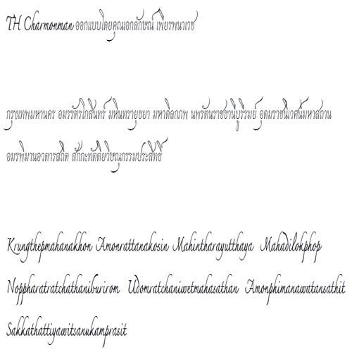 | คำอธิบาย : ฟอนต์ TH Charmonman (จามรมาน) ออกแบบโดย คุณเอกลักษณ์ เพียรพนาเวชในปี พ.ศ. 2553 ด้วยกรมทรัพย์สินทางปัญญา ร่วมกับสำนักงานส่งเสริมอุตสาหกรรมซอฟต์แวร์แห่งชาติ (องค์การมหาชน) ได้จัดโครงการประกวดผลงานสร้างสรรค์โปรแกรมคอมพิวเตอร์ฟอนต์ขึ้น เพื่อส่งเสริมให้มีการพัฒนาและสร้างสรรค์ผลงานลิขสิทธิ์โปรแกรมคอมพิวเตอร์ฟอนต์เพิ่มขึ้น เป็นการสร้างงาน สร้างทักษะ และสร้างตลาดทางด้านอุตสาหกรรมซอฟต์แวร์ของประเทศ อันจะเป็นประโยชน์ต่อสังคมและผู้บริโภคที่สามารถเลือกใช้โปรแกรมคอมพิวเตอร์ฟอนต์ที่มีความหลากลายมากขึ้นต่อไปฟอนต์นี้เป็นหนึ่งในโครงการเผยแพร่ฟอนต์ลิขสิทธิ์จากสำนักงานส่งเสริมอุตสาหกรรมซอฟต์แวร์แห่งชาติ (SIPA) กระทรวงเทคโนโลยีสารสนเทศและการสื่อสาร เพื่อแจกจ่ายให้ใช้อย่างเสรีปราศจากปัญหาด้านลิขสิทธิ์ เป็นความภาคภูมิใจในความเป็นชาติ และเอกลักษณ์ของความเป็นชาติไทย |