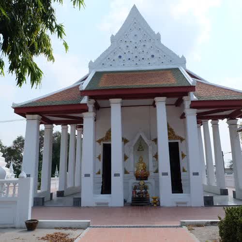 | คำอธิบาย : เป็นอุโบสถขนาด 5 ห้อง มีรูปแบบศิลปกรรมในรัชกาลที่ 3 คือการทำเสาทึบต้นทรงสี่เหลี่ยมไม่มีบัวหัวเสาร และหน้าบันมีการทำปูนปั้นประดับเครื่องถ้วยจีน ซุ้มหน้าต่างและประตูประดับปูนปั้นลายพันธุ์พฤกษา ส่วนหลังคาไม่มีการทำเครื่องลำยอง และใบเสมาขนาดเล็ก (ข้อมูลจาก ศูนย์ศึกษาศิลปกรรมโบราณในเอเชียอาคเนย์) |