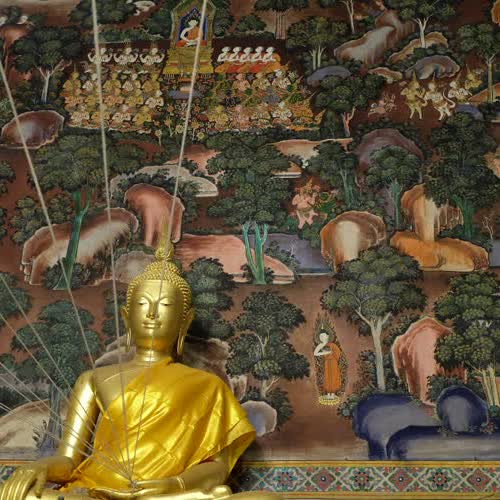 | คำอธิบาย : เป็นจิตรกรรมฝาผนังเกี่ยวกับเรื่องราวพุทธประวัติตอนปฐมเทศนา ทรงแสดงธัมมจักกัปปวัตตนสูตรแก่ปัญจวัคคีย์เทวดา และพรหมพลอยมาสดับด้วยเป็นอันมาก |