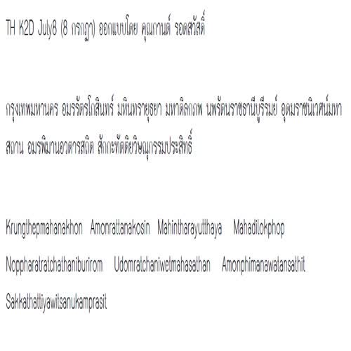 | คำอธิบาย : ฟอนต์ TH K2D July8 (8 กรกฏา) ออกแบบโดย คุณกานต์ รอดสวัสดิ์ในปี พ.ศ. 2553 ด้วยกรมทรัพย์สินทางปัญญา ร่วมกับสำนักงานส่งเสริมอุตสาหกรรมซอฟต์แวร์แห่งชาติ (องค์การมหาชน) ได้จัดโครงการประกวดผลงานสร้างสรรค์โปรแกรมคอมพิวเตอร์ฟอนต์ขึ้น เพื่อส่งเสริมให้มีการพัฒนาและสร้างสรรค์ผลงานลิขสิทธิ์โปรแกรมคอมพิวเตอร์ฟอนต์เพิ่มขึ้น เป็นการสร้างงาน สร้างทักษะ และสร้างตลาดทางด้านอุตสาหกรรมซอฟต์แวร์ของประเทศ อันจะเป็นประโยชน์ต่อสังคมและผู้บริโภคที่สามารถเลือกใช้โปรแกรมคอมพิวเตอร์ฟอนต์ที่มีความหลากลายมากขึ้นต่อไปฟอนต์นี้เป็นหนึ่งในโครงการเผยแพร่ฟอนต์ลิขสิทธิ์จากสำนักงานส่งเสริมอุตสาหกรรมซอฟต์แวร์แห่งชาติ (SIPA) กระทรวงเทคโนโลยีสารสนเทศและการสื่อสาร เพื่อแจกจ่ายให้ใช้อย่างเสรีปราศจากปัญหาด้านลิขสิทธิ์ เป็นความภาคภูมิใจในความเป็นชาติ และเอกลักษณ์ของความเป็นชาติไทย |