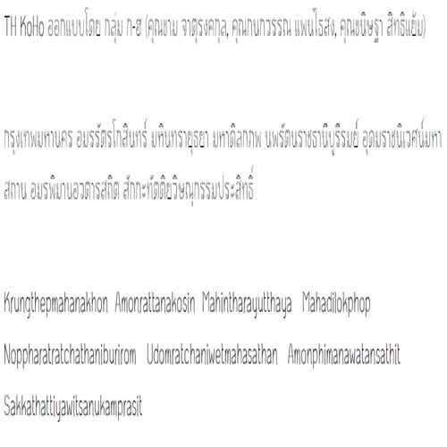 | คำอธิบาย : ฟอนต์ TH KoHo (กอ ฮอ) ออกแบบโดย กลุ่ม ก-ฮ (คุณขาม จาตุรงคกุล, คุณกนกวรรณ แพนไธสง, คุณขนิษฐา สิทธิแย้ม)ในปี พ.ศ. 2553 ด้วยกรมทรัพย์สินทางปัญญา ร่วมกับสำนักงานส่งเสริมอุตสาหกรรมซอฟต์แวร์แห่งชาติ (องค์การมหาชน) ได้จัดโครงการประกวดผลงานสร้างสรรค์โปรแกรมคอมพิวเตอร์ฟอนต์ขึ้น เพื่อส่งเสริมให้มีการพัฒนาและสร้างสรรค์ผลงานลิขสิทธิ์โปรแกรมคอมพิวเตอร์ฟอนต์เพิ่มขึ้น เป็นการสร้างงาน สร้างทักษะ และสร้างตลาดทางด้านอุตสาหกรรมซอฟต์แวร์ของประเทศ อันจะเป็นประโยชน์ต่อสังคมและผู้บริโภคที่สามารถเลือกใช้โปรแกรมคอมพิวเตอร์ฟอนต์ที่มีความหลากลายมากขึ้นต่อไปฟอนต์นี้เป็นหนึ่งในโครงการเผยแพร่ฟอนต์ลิขสิทธิ์จากสำนักงานส่งเสริมอุตสาหกรรมซอฟต์แวร์แห่งชาติ (SIPA) กระทรวงเทคโนโลยีสารสนเทศและการสื่อสาร เพื่อแจกจ่ายให้ใช้อย่างเสรีปราศจากปัญหาด้านลิขสิทธิ์ เป็นความภาคภูมิใจในความเป็นชาติ และเอกลักษณ์ของความเป็นชาติไทย |