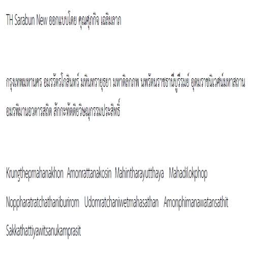 | คำอธิบาย : ฟอนต์ TH Sarabun New (สารบรรณ) ออกแบบโดย คุณศุภกิจ เฉลิมลาภในปี พ.ศ. 2553 ด้วยกรมทรัพย์สินทางปัญญา ร่วมกับสำนักงานส่งเสริมอุตสาหกรรมซอฟต์แวร์แห่งชาติ (องค์การมหาชน) ได้จัดโครงการประกวดผลงานสร้างสรรค์โปรแกรมคอมพิวเตอร์ฟอนต์ขึ้น เพื่อส่งเสริมให้มีการพัฒนาและสร้างสรรค์ผลงานลิขสิทธิ์โปรแกรมคอมพิวเตอร์ฟอนต์เพิ่มขึ้น เป็นการสร้างงาน สร้างทักษะ และสร้างตลาดทางด้านอุตสาหกรรมซอฟต์แวร์ของประเทศ อันจะเป็นประโยชน์ต่อสังคมและผู้บริโภคที่สามารถเลือกใช้โปรแกรมคอมพิวเตอร์ฟอนต์ที่มีความหลากลายมากขึ้นต่อไปฟอนต์นี้เป็นหนึ่งในโครงการเผยแพร่ฟอนต์ลิขสิทธิ์จากสำนักงานส่งเสริมอุตสาหกรรมซอฟต์แวร์แห่งชาติ (SIPA) กระทรวงเทคโนโลยีสารสนเทศและการสื่อสาร เพื่อแจกจ่ายให้ใช้อย่างเสรีปราศจากปัญหาด้านลิขสิทธิ์ เป็นความภาคภูมิใจในความเป็นชาติ และเอกลักษณ์ของความเป็นชาติไทย |