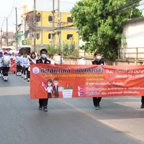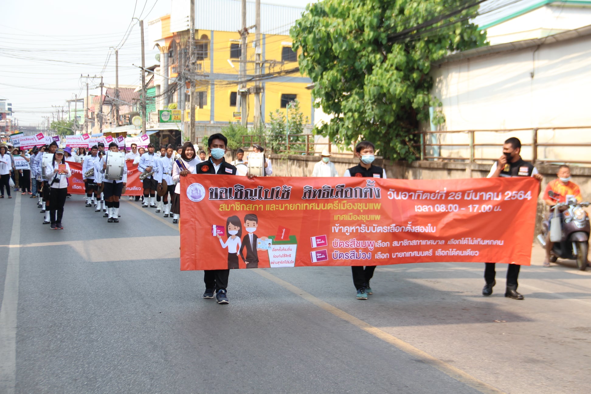 | คำอธิบาย : เช้าวันที่ 26 มีนาคม 2564 นายณัฐภูมิ นนทสิริกุล ปลัดเทศบาลเมืองชุมแพ ปฏิบัติหน้าที่นายกเทศมนตรีเมืองชุมแพ และผู้อำนวยการการเลือกตั้งประจำเทศบาลเมืองชุมแพ นำหัวหน้าส่วนการงาน พนักงานเทศบาลเมืองชุมแพ และนักเรียนโรงเรียนเทศบาล 1 (สำนักงานสลากกินแบ่งรัฐบาลอุปถัมภ์) ออกเดินรณรงค์เชิญชวนให้ประชาชนไปใช้สิทธิเลือกตั้งสมาชิกสภาเทศบาลและนายกเทศมนตรีเมืองชุมแพ ซึ่งจะมีขึ้นในวันอาทิตย์ ที่ 28 มีนาคม 2564 |