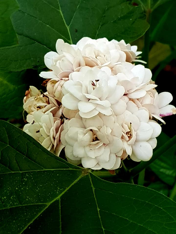 | คำอธิบาย : นางแย้มไม้พุ่มลำต้นเปราะหักง่าย ชอบดินชุ่มขยายพันธุ์ง่ายรากไปถึงตรงไหนก็แตกต้นอ่อนได้ ดอกช่อใหญ่และมีดอกเล็กๆอัดกันในช่อออกทั้งปี ดอกมีกลิ่นหอมดอกเล็กๆจะทะยอยบาน ตัดต้นออกถ้ายังมีต้นตอและรากอยู่ก็จะงอกอีก |