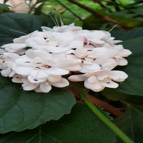 | คำอธิบาย : นางแย้มไม้พุ่มลำต้นเปราะหักง่าย ชอบดินชุ่มขยายพันธุ์ง่ายรากไปถึงตรงไหนก็แตกต้นอ่อนได้ ดอกช่อใหญ่และมีดอกเล็กๆอัดกันในช่อออกทั้งปี ดอกมีกลิ่นหอมดอกเล็กๆจะทะยอยบาน ตัดต้นออกถ้ายังมีต้นตอและรากอยู่ก็จะงอกอีก |