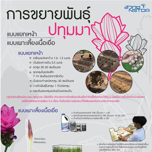 | ชื่อเรื่อง : การขยายพันธุ์ปทุมมาแบบแยกเหง้า แบบเพาะเลี้ยงเนื้อเยื่อ |