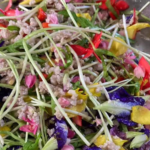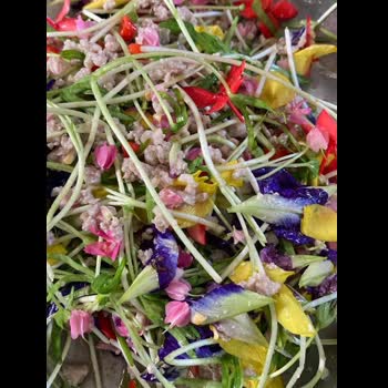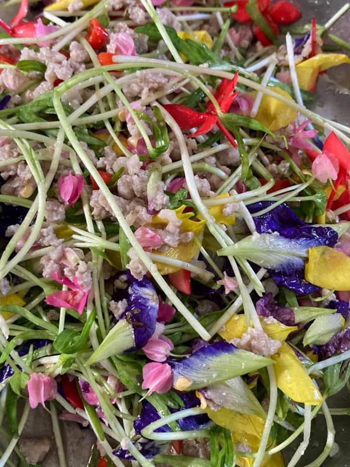 | คำอธิบาย : ยำบุปผาชาติ บรรดาดอกไม้รอบๆตัวเรา เราสามารถนำมาสร้างสรรค์เมนูแปลกๆได้ โดยการนำมายำ, ผัด และจิ้มน้ำพริก แต่เราจะต้องแน่ใจว่าดอกไม้นี้ เหล่าบรรดาพวกนก, แพะ ฯลฯ กินแล้วไม่เมาไม่มีพิษภัยใดๆทั้งสิ้น คนก็สามารถกินได้เช่นกันCr. ภาพ Thee Kanthee |