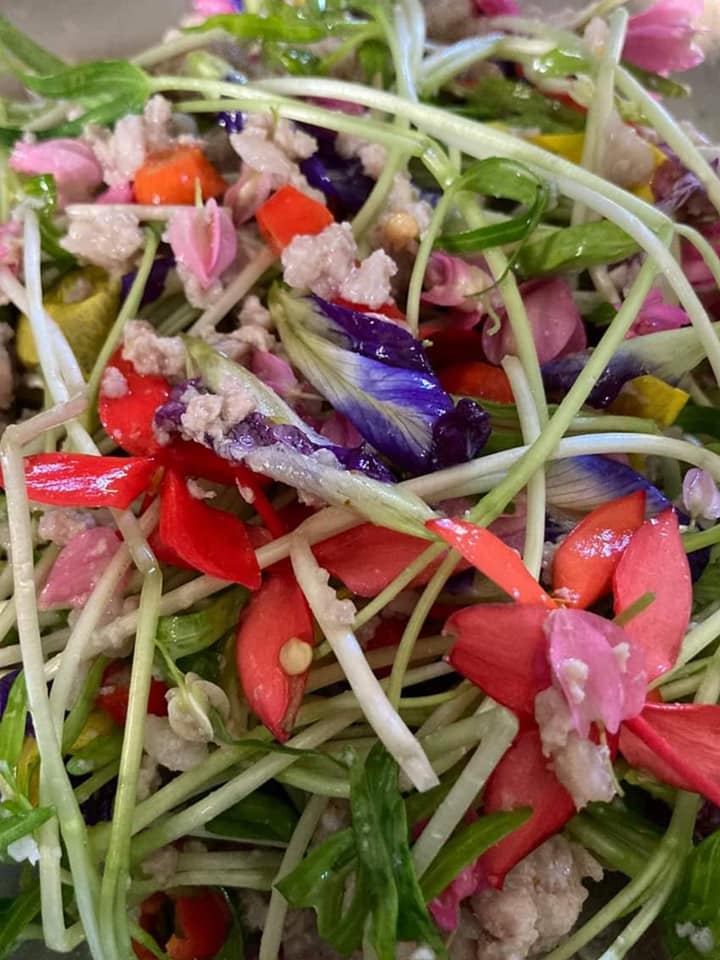 | คำอธิบาย : ยำบุปผาชาติ บรรดาดอกไม้รอบๆตัวเรา เราสามารถนำมาสร้างสรรค์เมนูแปลกๆได้ โดยการนำมายำ, ผัด และจิ้มน้ำพริก แต่เราจะต้องแน่ใจว่าดอกไม้นี้ เหล่าบรรดาพวกนก, แพะ ฯลฯ กินแล้วไม่เมาไม่มีพิษภัยใดๆทั้งสิ้น คนก็สามารถกินได้เช่นกันCr. ภาพ Thee Kanthee |