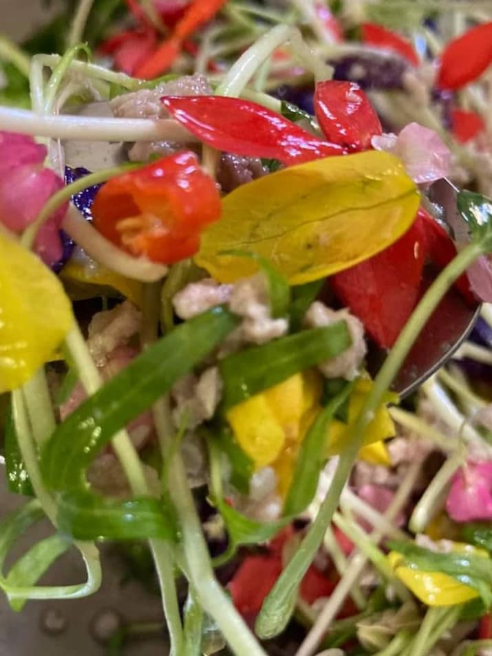 | คำอธิบาย : ยำบุปผาชาติ บรรดาดอกไม้รอบๆตัวเรา เราสามารถนำมาสร้างสรรค์เมนูแปลกๆได้ โดยการนำมายำ, ผัด และจิ้มน้ำพริก แต่เราจะต้องแน่ใจว่าดอกไม้นี้ เหล่าบรรดาพวกนก, แพะ ฯลฯ กินแล้วไม่เมาไม่มีพิษภัยใดๆทั้งสิ้น คนก็สามารถกินได้เช่นกันCr. ภาพ Thee Kanthee |