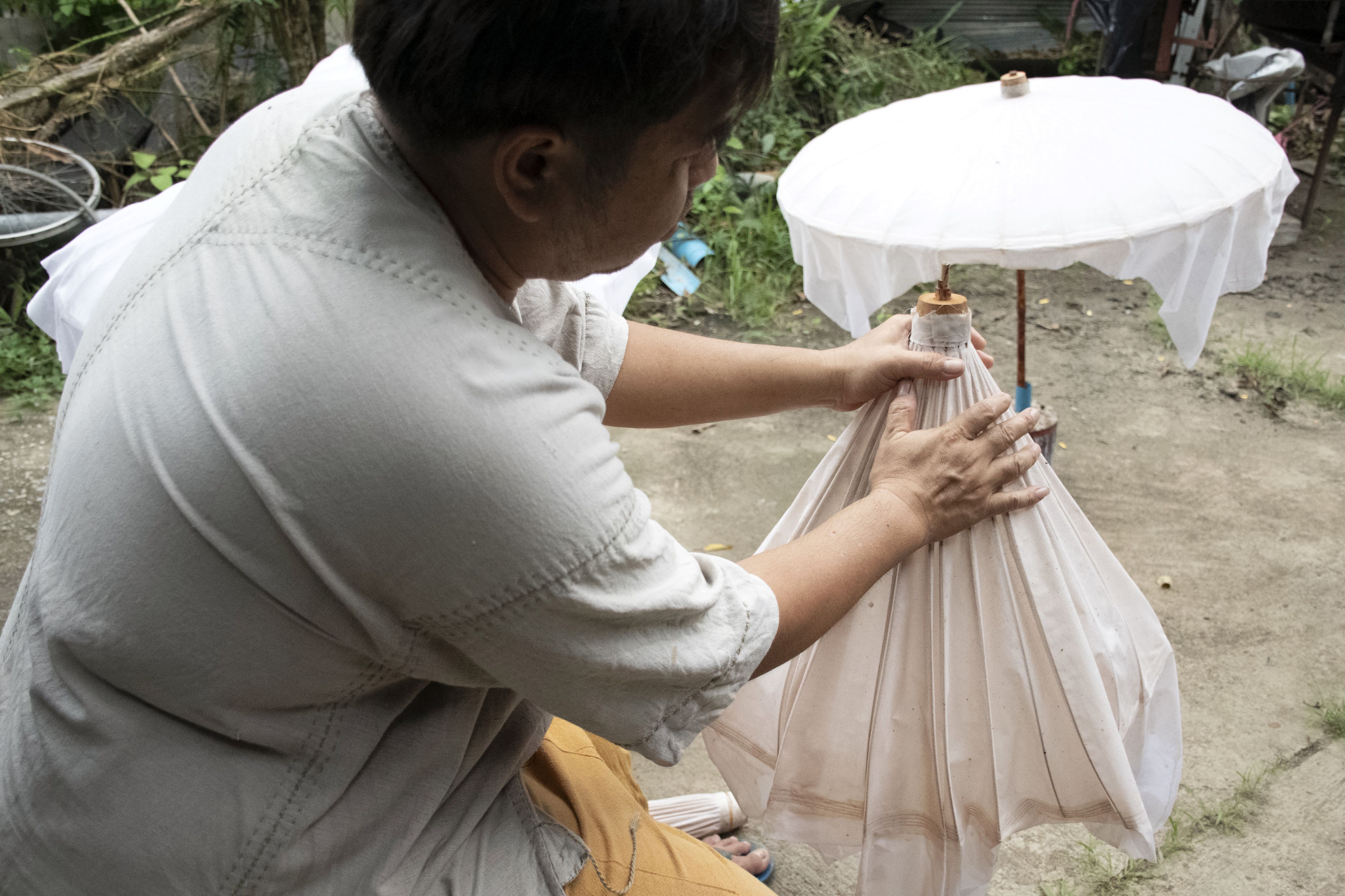 การทำร่มโบราณ บ้านมะกายยอน ได้รับใบอนุญาตภายใต้ ให้เผยแพร่-โดยต้องระบุที่มาแต่ห้ามดัดแปลงและห้ามใช้เพื่อการค้า 3.0 Thailand.