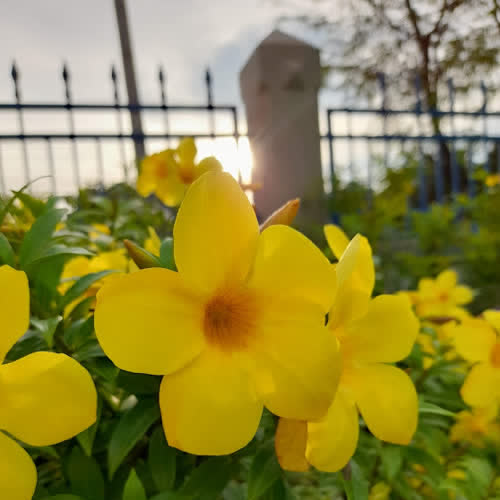 | คำอธิบาย : บานบุรีเหลือง ชื่อสามัญ Allamanda, Common allamanda, Golden trumpet, Golden trumpet vine, Yellow bell ชื่อวิทยาศาสตร์ Allamanda cathartica L. จัดอยู่ในวงศ์ตีนเป็ด (APOCYNACEAE) ดอกบานบุรีเหลือง เป็นดอกไม้ประจำจังหวัดนราธิวาส บานบุรี มีอยู่ด้วยหลายชนิด โดยบานบุรีสีเหลือง บานบุรีสีกุหลาบ และบานพารา จะอยู่ในสกุลเดียวกันคือ สกุล Allamanda ส่วนบานบุรีสีแสด (บ้างเรียกว่า "บานบุรีหอม") จะอยู่ในสกุล Odontadenia และบานบุรีสีม่วง จะอยู่ในสกุล Saritaea แต่ทั้งหมดนี้จะอยู่ในวงศ์เดียวกัน คือ วงศ์ตีนเป็ด ยกเว้นบานบุรีม่วงที่จะจัดอยู่ในวงศ์แคหางค่าง (BIGNONIACEAE) |