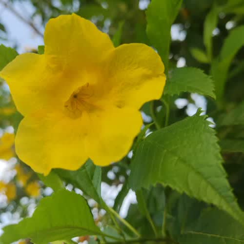 | คำอธิบาย : ทองอุไร (อังกฤษ: Yellow elder, Trumpetbush, Trumpetflower, Yellow trumpet-flower, Yellow trumpetbush; ชื่อวิทยาศาสตร์: Tecoma stans (L.) Juss. ex Kunth) เป็นไม้พุ่มขนาดเล็กสูง 2-4 เมตร ลำต้นเล็ก แผ่กิ่งด้านบนเป็นพุ่มกลม โปร่ง ใบประกอบขนนกมีใบย่อยที่ปลายสุด จำนวน 7-11 ใบ สีเขียวอ่อน ขอบใบย่อยหยิกเป็นฟันเลื่อย ผิวสัมผัสละเอียด ลำต้นสีน้ำตาลนวลตลอดทั้งต้น ก้านใบช่อดอกอ่อนเป็นสีเขียว ดอกสีเหลืองสด มีรูปลักษณ์คลายระฆัง หรือแตร หรือทรัมเป็ต ออกดอกเป็นช่อตามปลายกิ่ง ดอกดกมาก กลีบดอกติดกันเป็นรูปกรวยยาว 3-4 เซนติเมตร ปลายกลีบมี 5 กลีบ มีลักษณะกลมเป็นคลื่นเล็กน้อย กลีบเลี้ยงเป็นรูปกระดิ่งสีเหลือง แยก 5 แฉกกลีบดอกปลายแยก 5 กลีบรับกัน เกสรตัวผู้ เติบโตได้ดีในดินร่วนทุกชนิด ที่ความชื้นปานกลาง ระบายน้ำได้ดี แสงแดดจัดเต็มวัน |
