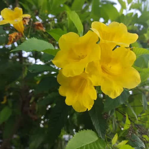 | คำอธิบาย : ทองอุไร (อังกฤษ: Yellow elder, Trumpetbush, Trumpetflower, Yellow trumpet-flower, Yellow trumpetbush; ชื่อวิทยาศาสตร์: Tecoma stans (L.) Juss. ex Kunth) เป็นไม้พุ่มขนาดเล็กสูง 2-4 เมตร ลำต้นเล็ก แผ่กิ่งด้านบนเป็นพุ่มกลม โปร่ง ใบประกอบขนนกมีใบย่อยที่ปลายสุด จำนวน 7-11 ใบ สีเขียวอ่อน ขอบใบย่อยหยิกเป็นฟันเลื่อย ผิวสัมผัสละเอียด ลำต้นสีน้ำตาลนวลตลอดทั้งต้น ก้านใบช่อดอกอ่อนเป็นสีเขียว ดอกสีเหลืองสด มีรูปลักษณ์คลายระฆัง หรือแตร หรือทรัมเป็ต ออกดอกเป็นช่อตามปลายกิ่ง ดอกดกมาก กลีบดอกติดกันเป็นรูปกรวยยาว 3-4 เซนติเมตร ปลายกลีบมี 5 กลีบ มีลักษณะกลมเป็นคลื่นเล็กน้อย กลีบเลี้ยงเป็นรูปกระดิ่งสีเหลือง แยก 5 แฉกกลีบดอกปลายแยก 5 กลีบรับกัน เกสรตัวผู้ เติบโตได้ดีในดินร่วนทุกชนิด ที่ความชื้นปานกลาง ระบายน้ำได้ดี แสงแดดจัดเต็มวัน |
