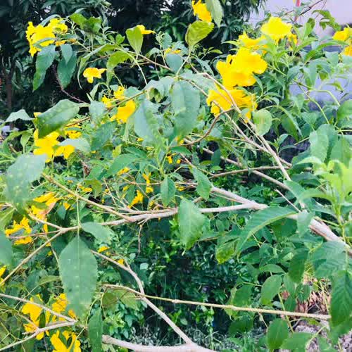 | คำอธิบาย : ทองอุไร (อังกฤษ: Yellow elder, Trumpetbush, Trumpetflower, Yellow trumpet-flower, Yellow trumpetbush; ชื่อวิทยาศาสตร์: Tecoma stans (L.) Juss. ex Kunth) เป็นไม้พุ่มขนาดเล็กสูง 2-4 เมตร ลำต้นเล็ก แผ่กิ่งด้านบนเป็นพุ่มกลม โปร่ง ใบประกอบขนนกมีใบย่อยที่ปลายสุด จำนวน 7-11 ใบ สีเขียวอ่อน ขอบใบย่อยหยิกเป็นฟันเลื่อย ผิวสัมผัสละเอียด ลำต้นสีน้ำตาลนวลตลอดทั้งต้น ก้านใบช่อดอกอ่อนเป็นสีเขียว ดอกสีเหลืองสด มีรูปลักษณ์คลายระฆัง หรือแตร หรือทรัมเป็ต ออกดอกเป็นช่อตามปลายกิ่ง ดอกดกมาก กลีบดอกติดกันเป็นรูปกรวยยาว 3-4 เซนติเมตร ปลายกลีบมี 5 กลีบ มีลักษณะกลมเป็นคลื่นเล็กน้อย กลีบเลี้ยงเป็นรูปกระดิ่งสีเหลือง แยก 5 แฉกกลีบดอกปลายแยก 5 กลีบรับกัน เกสรตัวผู้ เติบโตได้ดีในดินร่วนทุกชนิด ที่ความชื้นปานกลาง ระบายน้ำได้ดี แสงแดดจัดเต็มวัน |
