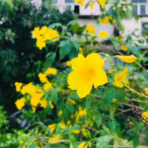 | คำอธิบาย : ทองอุไร (อังกฤษ: Yellow elder, Trumpetbush, Trumpetflower, Yellow trumpet-flower, Yellow trumpetbush; ชื่อวิทยาศาสตร์: Tecoma stans (L.) Juss. ex Kunth) เป็นไม้พุ่มขนาดเล็กสูง 2-4 เมตร ลำต้นเล็ก แผ่กิ่งด้านบนเป็นพุ่มกลม โปร่ง ใบประกอบขนนกมีใบย่อยที่ปลายสุด จำนวน 7-11 ใบ สีเขียวอ่อน ขอบใบย่อยหยิกเป็นฟันเลื่อย ผิวสัมผัสละเอียด ลำต้นสีน้ำตาลนวลตลอดทั้งต้น ก้านใบช่อดอกอ่อนเป็นสีเขียว ดอกสีเหลืองสด มีรูปลักษณ์คลายระฆัง หรือแตร หรือทรัมเป็ต ออกดอกเป็นช่อตามปลายกิ่ง ดอกดกมาก กลีบดอกติดกันเป็นรูปกรวยยาว 3-4 เซนติเมตร ปลายกลีบมี 5 กลีบ มีลักษณะกลมเป็นคลื่นเล็กน้อย กลีบเลี้ยงเป็นรูปกระดิ่งสีเหลือง แยก 5 แฉกกลีบดอกปลายแยก 5 กลีบรับกัน เกสรตัวผู้ เติบโตได้ดีในดินร่วนทุกชนิด ที่ความชื้นปานกลาง ระบายน้ำได้ดี แสงแดดจัดเต็มวัน |